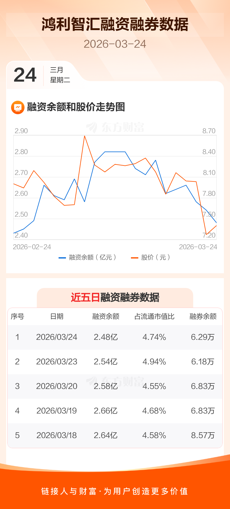 交易所最新数据显示,鸿利智汇于2026年3月24日获融资买入2482.32万元,融资偿还3078.93万元,当日融资净偿还596.61万元。目前,该股融资余额2.48亿,占流通市值比例为4.74%。