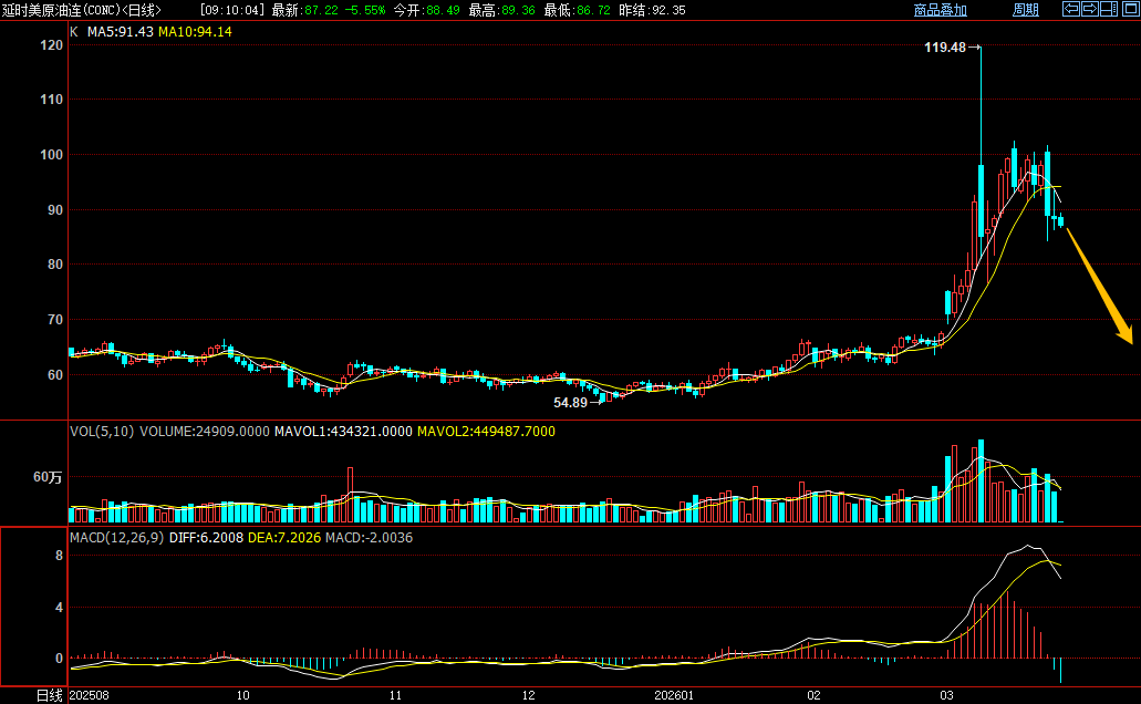 近期原油价格已出现明显冲高回落迹象,3月下旬布伦特原油从120美元/桶上方快速回落至90美元/桶下方,国内SC原油期货同步大幅回调,成交量与持仓量同步萎缩,投机资金逐步离场,标志着第一波暴力上涨行情彻底结束。