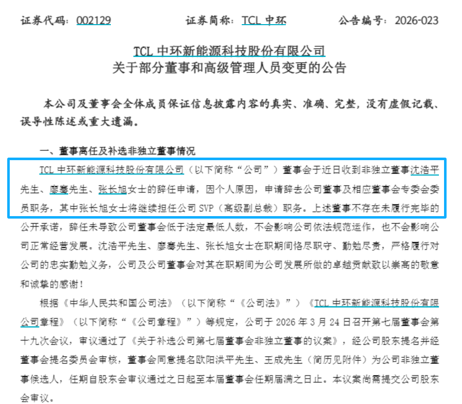 3月24日,TCL中环发布高管变动公告图片来源:公司公告