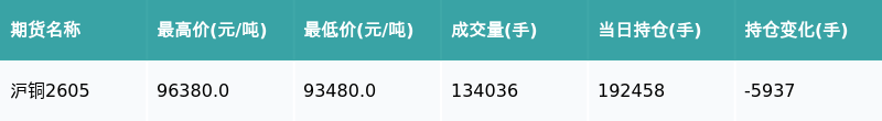 南财智讯3月25日电,盘后期货数据显示,上海期货交易所的沪铜主力合约收涨1.14%,收盘报95590.0元/吨,日内资金流出3.1亿元。其他相关指标见下表: