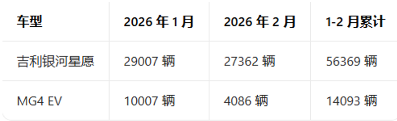 日前,全国乘联会公布了今年1-2月车市销量数据,其中在10万元以内纯电小型车市场,吉利星愿以近6万辆的销量夺魁,成为细分市场的绝对王者;紧随其后的MG4,即使交出月销破万的不俗成绩单,仍与前者有着近3倍的差距。