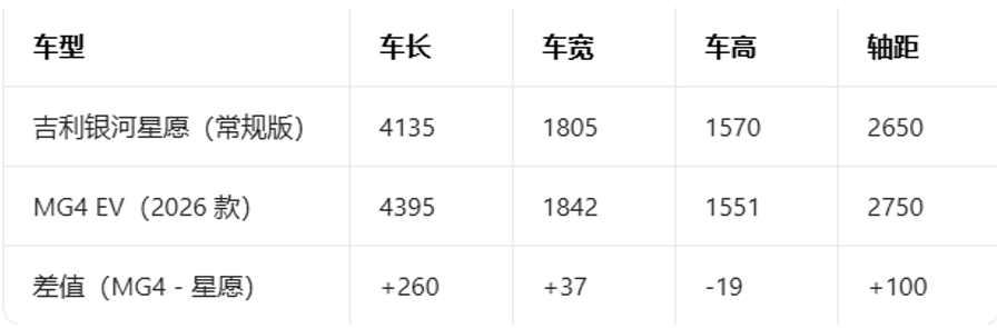 续航层面,以双方主力走量版本为例,吉利星愿主力款CLTC续航多在310km-410km区间,而MG4同价位车型CLTC续航直接做到437km,部分版本更是突破500km,续航差距最高达127km;空间尺寸上,MG4车身长宽高达到4395/1842/1551mm,轴距长达2750mm;吉利星愿车身尺寸为4135/1805/1570mm,轴距2650mm。100mm的轴距差距,直接转化为后排腿部空间多出近一拳,后备厢容积也更充裕。