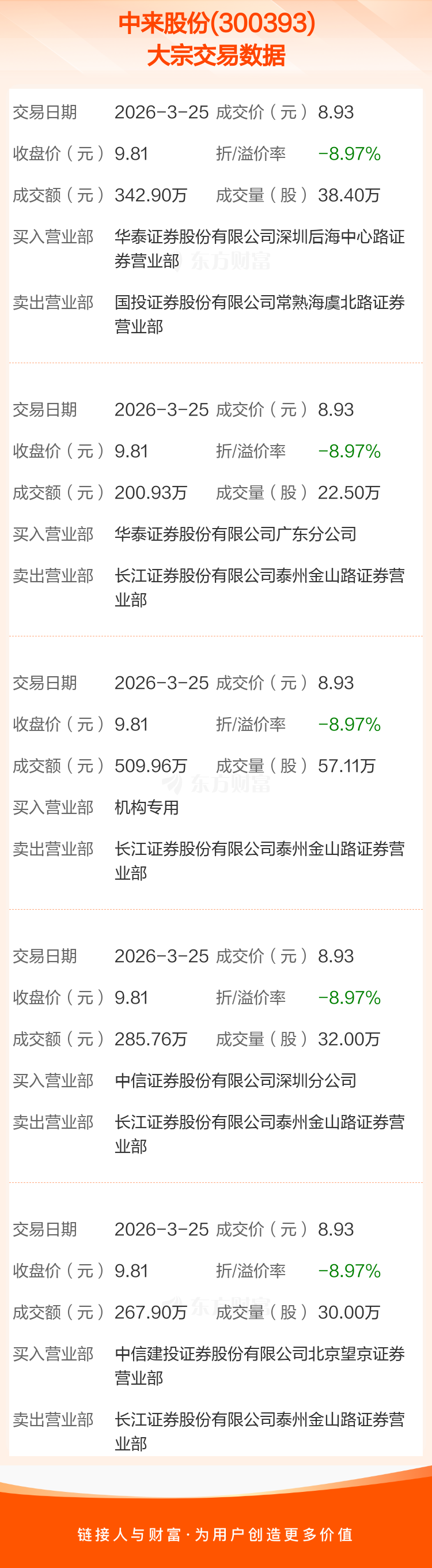 2026年3月25日,中来股份发生5笔大宗交易,共成交180.01万股,成交金额1607.45万元,占其流通市值比例为0.17%。