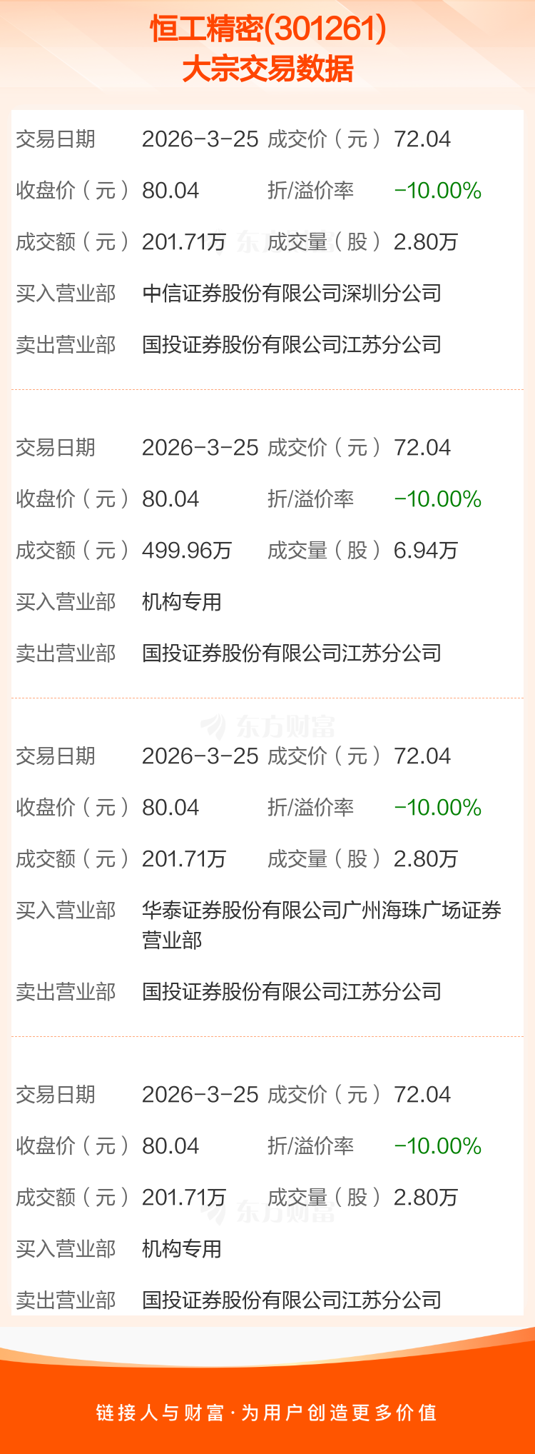 2026年3月25日,恒工精密发生4笔大宗交易,共成交15.34万股,成交金额1105.09万元,占其流通市值比例为0.37%。