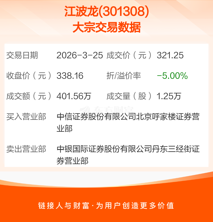 2026年3月25日,江波龙发生1笔大宗交易,共成交1.25万股,成交金额401.56万元。