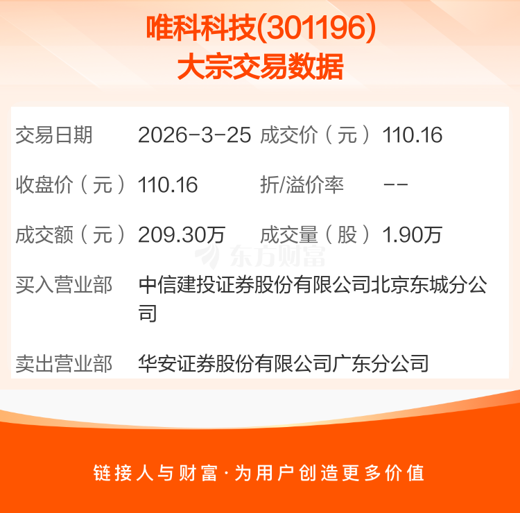 2026年3月25日,唯科科技发生1笔大宗交易,共成交1.90万股,成交金额209.30万元,占其流通市值比例为0.02%。