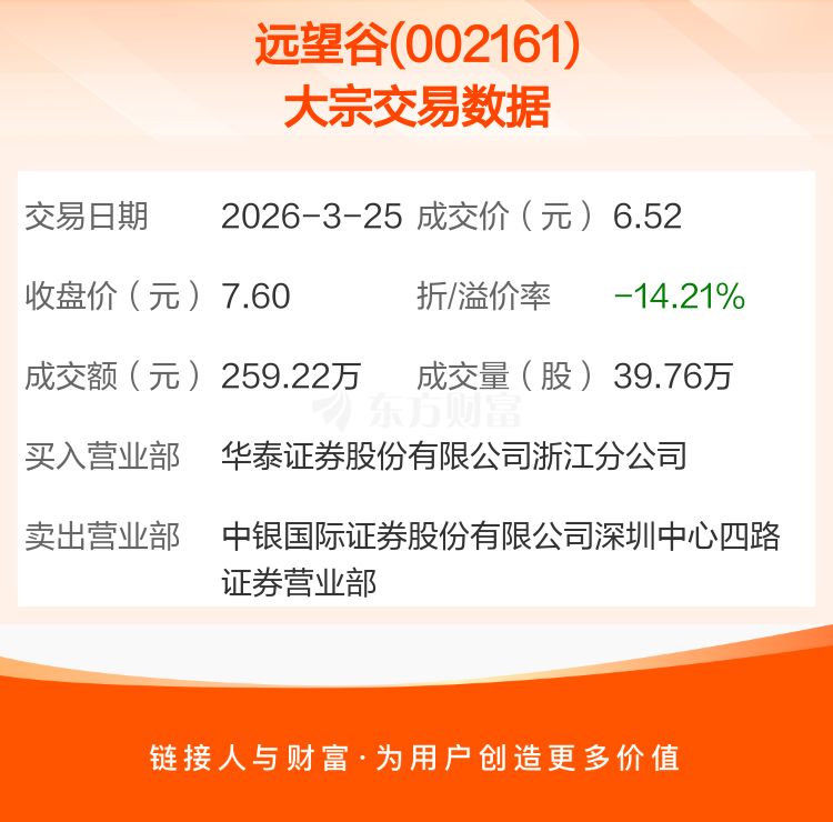 2026年3月25日,远望谷发生1笔大宗交易,共成交39.76万股,成交金额259.22万元,占其流通市值比例为0.05%。