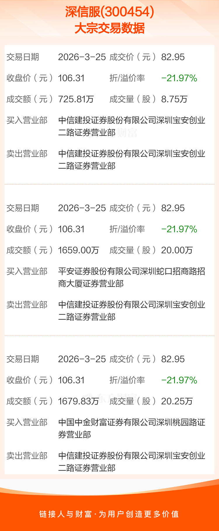 2026年3月25日,深信服发生3笔大宗交易,共成交49.00万股,成交金额4064.64万元,占其流通市值比例为0.13%。