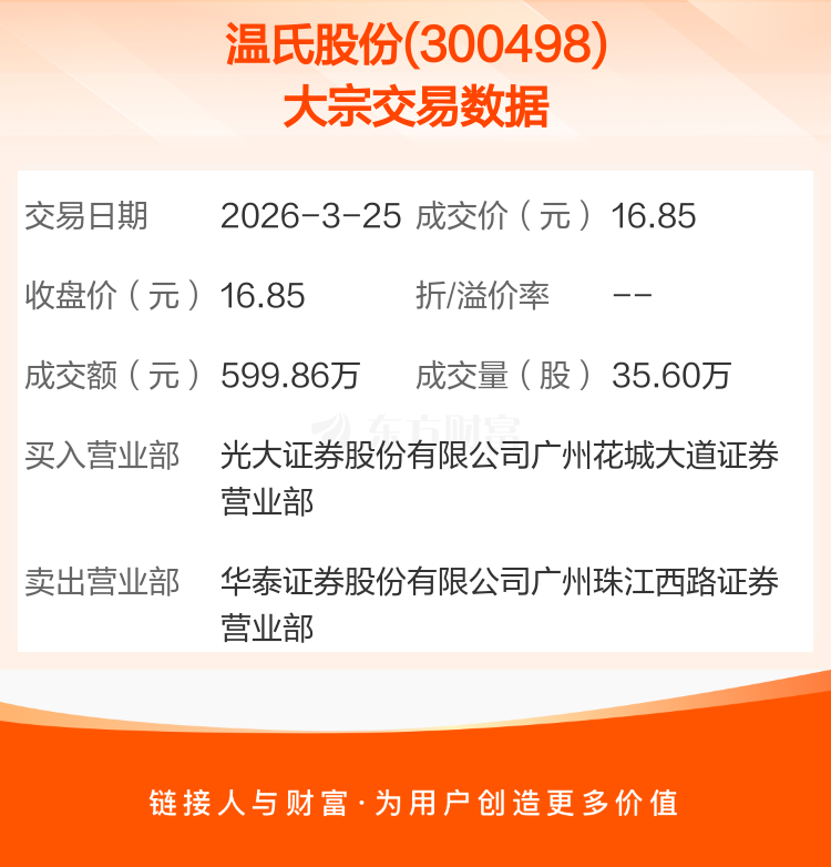 2026年3月25日,温氏股份发生1笔大宗交易,共成交35.60万股,成交金额599.86万元。
