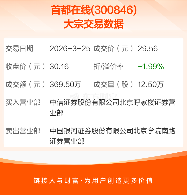 2026年3月25日,首都在线发生1笔大宗交易,共成交12.50万股,成交金额369.50万元,占其流通市值比例为0.03%。
