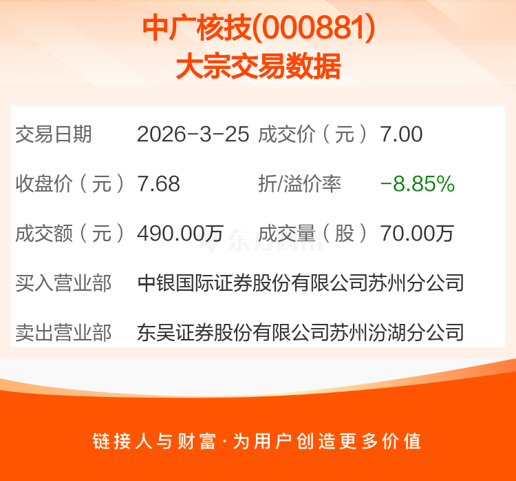 大宗交易:中广核技成交490.00万元,折价8.85%(3-25)