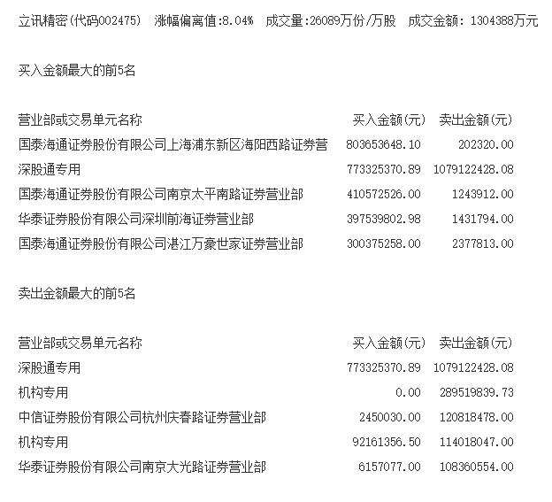 【游资动向】立讯精密涨停,国泰海通证券上海浦东新区海阳西路营业部买入逾8亿元