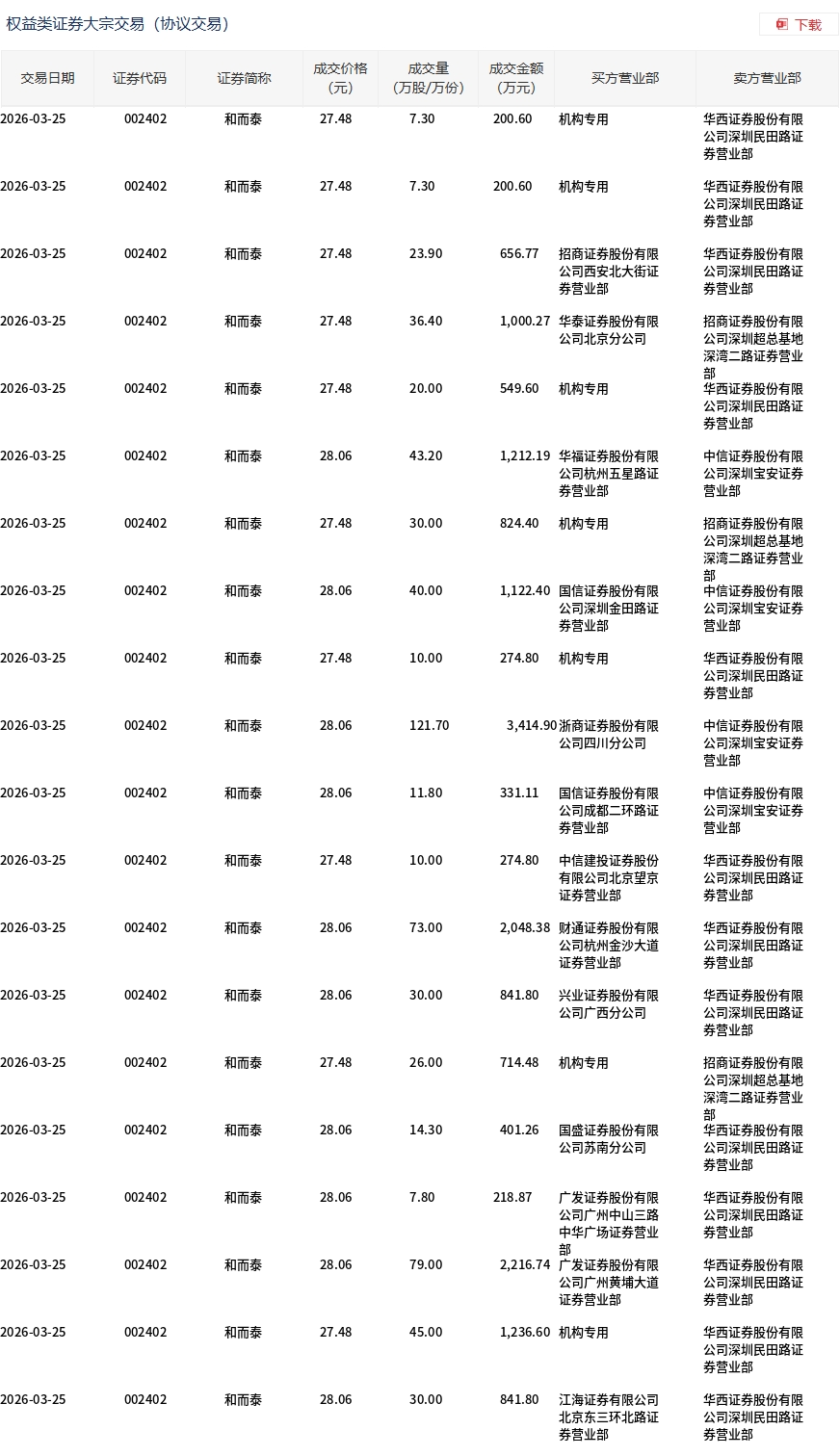 和而泰今日大宗交易成交916.9万股,成交额2.55亿元