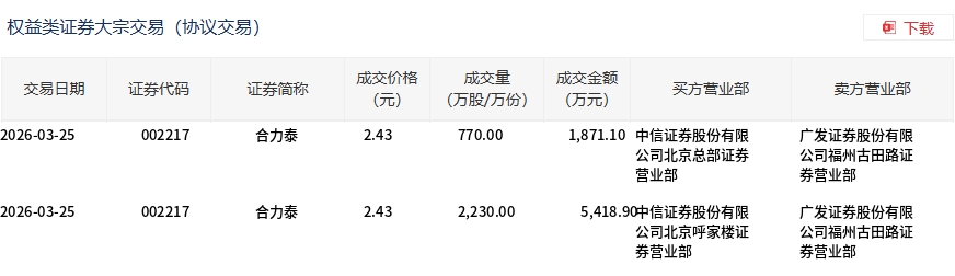 合力泰今日大宗交易折价成交3000万股,成交额7290万元