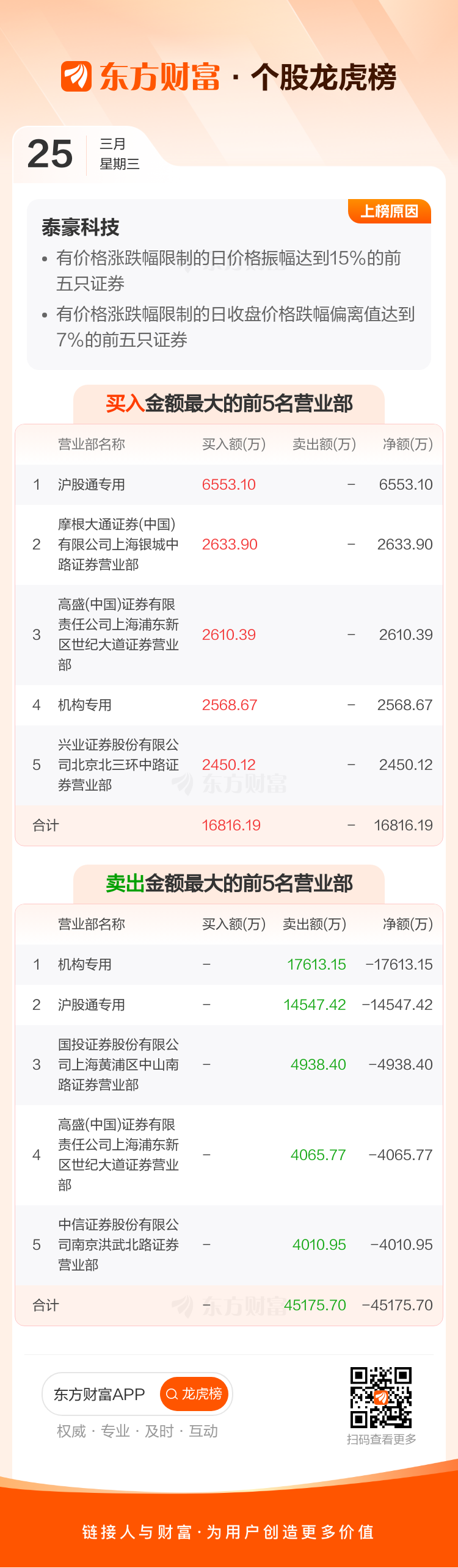 交易所2026年3月25日公布的交易公开信息显示,泰豪科技因成为有价格涨跌幅限制的日价格振幅达到15%的前五只证券、有价格涨跌幅限制的日收盘价格跌幅偏离值达到7%的前五只证券上榜。泰豪科技当日收报13.8元,涨跌幅-8.73%,偏离值17.74%,换手率20.83%,成交额25.90亿。