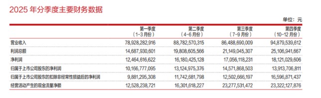 单季度来看,2025年第四季度公司实现营收948.80亿元,同比增长29.54%,环比增长9.70%;归母净利润139.14亿元,同比增长80.86%;扣非归母净利润165.97亿元,同比增长108.89%,环比增长32.75%,四季度扣非业绩超市场此前预告,为全年业绩收官画上圆满句号。