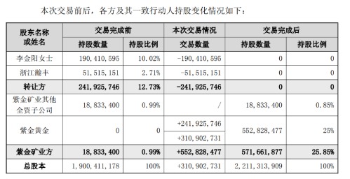 记者注意到,本次交易对价合计约182.58亿元,交易完成后紫金黄金将持有赤峰黄金增发后总股份数的25.85%,实现对赤峰黄金的财务并表,李金阳及浙江瀚丰则将彻底退出赤峰黄金持股。