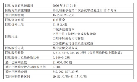 回购方面,2026年3月20日公司董事会审议通过回购A股股份方案,同意使用自有资金以集中竞价交易方式回购公司A股股份,回购资金总额为不低于15亿元且不超过25亿元,回购价格上限为41.5元/股,回购股份计划用于员工持股计划或股权激励,回购实施期限为自董事会审议通过之日起不超过12个月。