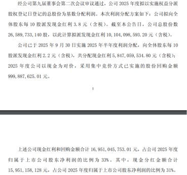 分红方面,公司拟向全体股东每10股派发现金红利3.8元(含税),拟派发现金红利合计101.04亿元(含税),叠加此前已完成的2025年中期分红58.5亿元,公司2025年全年分红规模将达159.5亿元,现金分红金额占2025年度归母净利润的比例为31%。同时公司还提请股东会授权董事会制定2026年中期利润分配方案,拟向全体股东每10股派发现金红利不少于3.8元(含税)。
