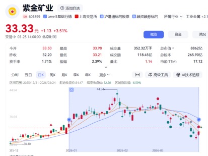 数据显示,截至2026年3月24日,紫金矿业A股收盘价为32.20元/股,2025年12月31日收盘价为34.47元/股,年度涨跌幅为-6.59%,股价在年内经历了冲高回落的波动过程,其中年度最高价达44.94元/股,最低价为29.80元/股。