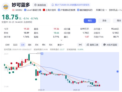 截至记者发稿,妙可蓝多股价报18.75元/股,日内跌幅0.74%;自年初至今的区间跌幅达10.49%,市值报95.64亿元。