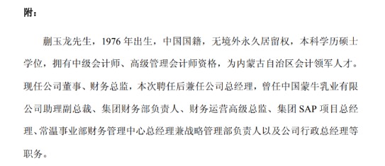 同时,公司聘任蒯玉龙担任总经理,法定代表人也相应变更为蒯玉龙。公开资料显示,蒯玉龙拥有多年蒙牛任职经历,曾任中国蒙牛乳业有限公司助理副总裁、集团财务部负责人等多个核心职务,是典型的蒙牛系职业经理人,此次任职也标志着妙可蓝多进入蒙牛系主导的管理阶段。