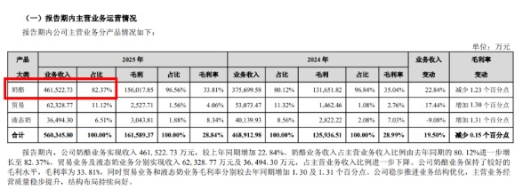 到2025年,奶酪业务(含奶酪棒)收入占公司总营收的比例已达82.37%,一个细分品类成为支撑上市公司发展的核心支柱。