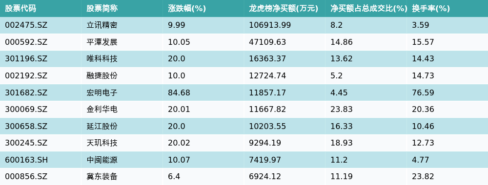 南财智讯3月25日电,盘后数据显示,因当日异动登上龙虎榜的个股中,资金净买入最多的前三位分别是立讯精密(002475.SZ)、平潭发展(000592.SZ)与唯科科技(301196.SZ)。其中排名第一的立讯精密净买额达10.69亿元,占总成交金额的8.2%。立讯精密当日收盘上涨9.99%,换手率为3.59%,净买入额前10个股详情见下图: