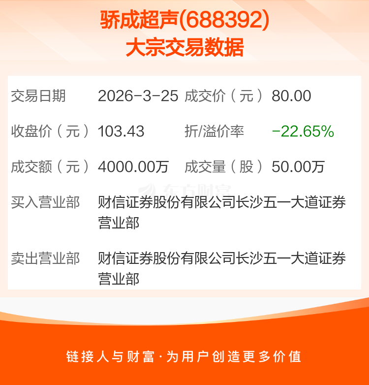 大宗交易:骄成超声成交4000.00万元,折价22.65%(3-25)