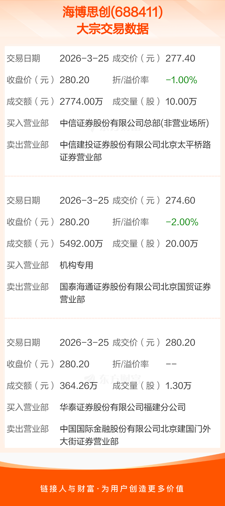 2026年3月25日,海博思创发生3笔大宗交易,共成交31.30万股,成交金额8630.26万元,占其流通市值比例为0.23%。