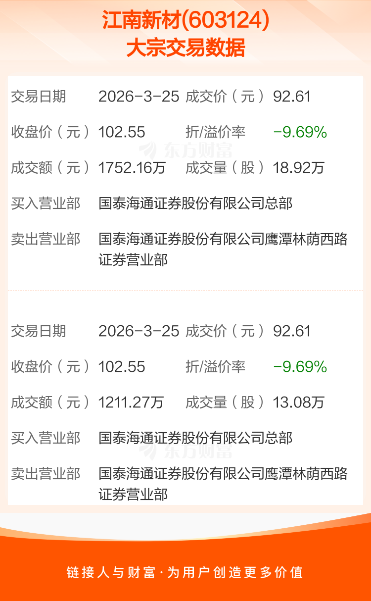 2026年3月25日,江南新材发生2笔大宗交易,共成交32.00万股,成交金额2963.43万元,占其流通市值比例为0.37%。