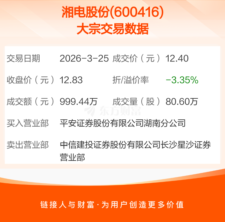 大宗交易:湘电股份成交999.44万元,折价3.35%(3-25)