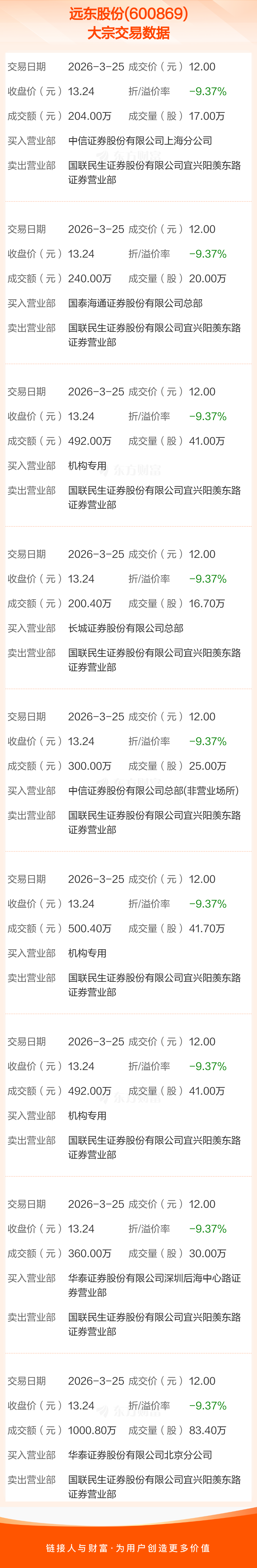 大宗交易:远东股份成交3789.60万元,折价9.37%(3-25)