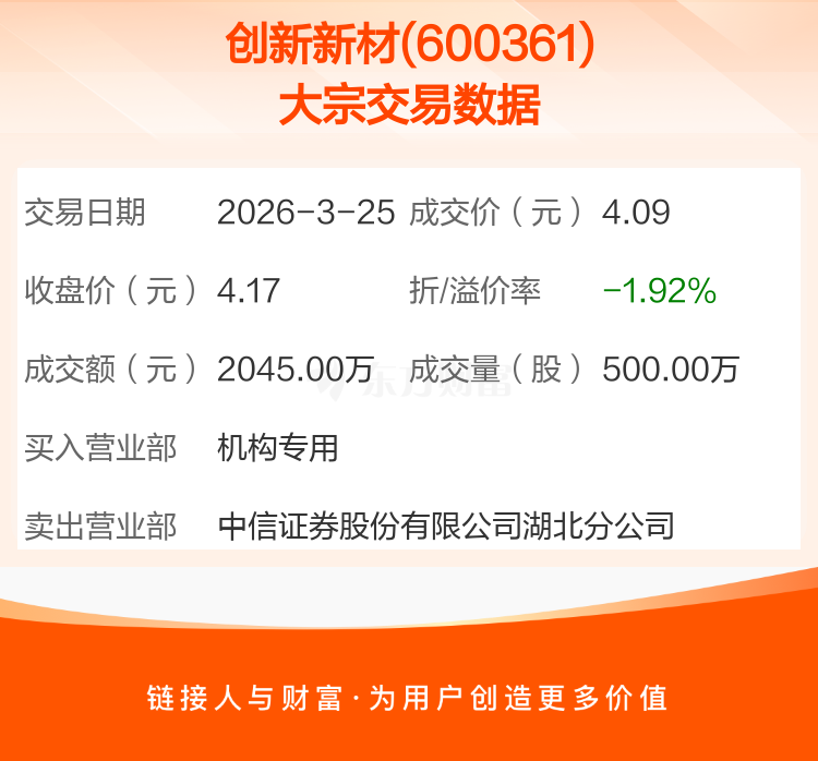2026年3月25日,创新新材发生1笔大宗交易,共成交500.00万股,成交金额2045.00万元,占其流通市值比例为0.13%。