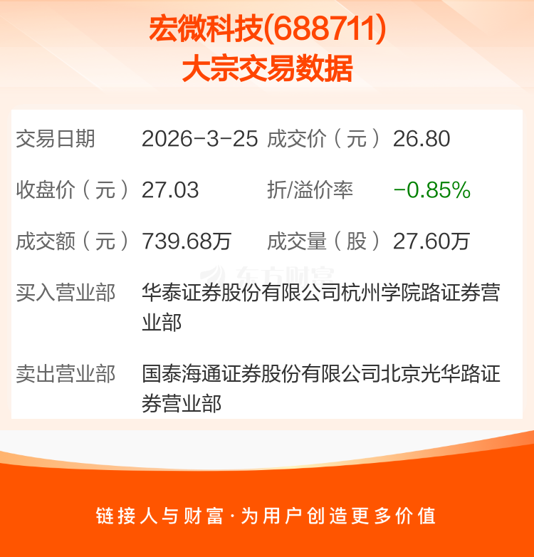 2026年3月25日,宏微科技发生1笔大宗交易,共成交27.60万股,成交金额739.68万元,占其流通市值比例为0.13%。