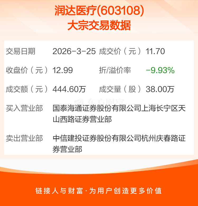2026年3月25日,润达医疗发生1笔大宗交易,共成交38.00万股,成交金额444.60万元,占其流通市值比例为0.06%。