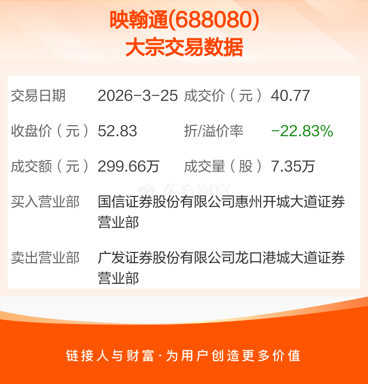 2026年3月25日,映翰通发生1笔大宗交易,共成交7.35万股,成交金额299.66万元,占其流通市值比例为0.08%。