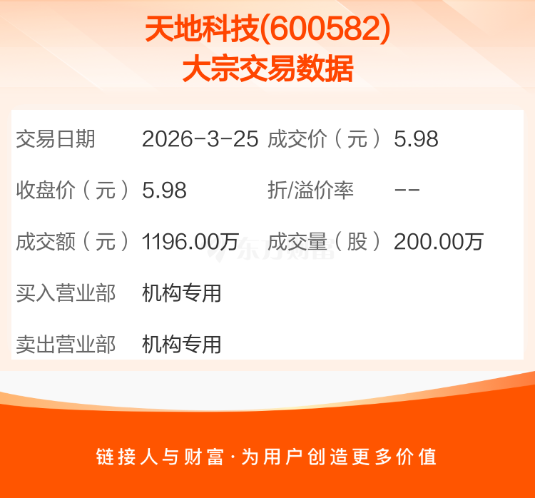 2026年3月25日,天地科技发生1笔大宗交易,共成交200.00万股,成交金额1196.00万元,占其流通市值比例为0.05%。
