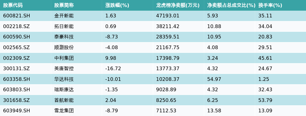 南财智讯3月25日电,盘后数据显示,因当日异动登上龙虎榜的个股中,龙虎榜中资金净流出最多的前三位分别是金开新能(600821.SH)、拓日新能(002218.SZ)与泰豪科技(600590.SH)。其中排名第一的金开新能被净卖出4.72亿元,占总成交金额的5.93%。金开新能收盘上涨1.63%,换手率为35.11%。净卖出额前10个股详情见下图: