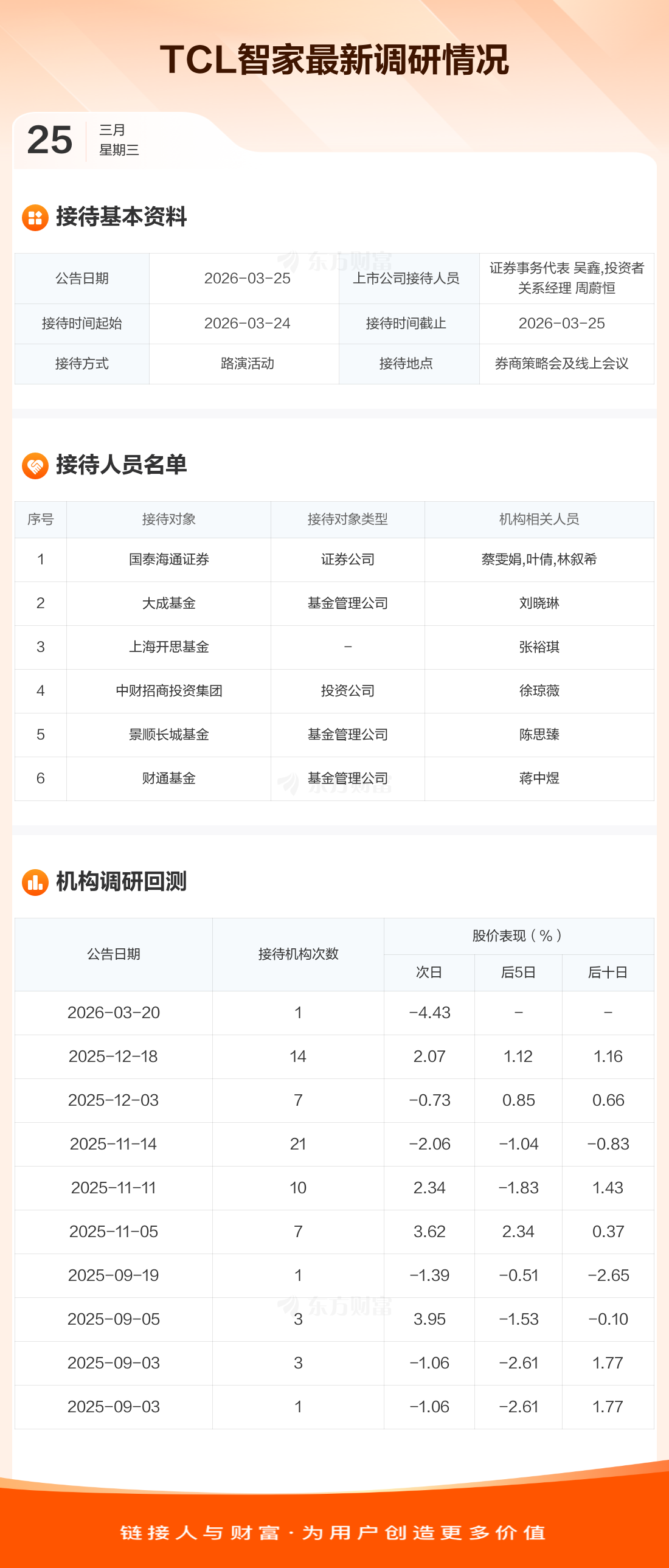 TCL智家3月25日公告称,3月24日至3月25日接待国泰海通证券等6家机构调研。接待人员包括证券事务代表 吴鑫,投资者关系经理 周蔚恒。