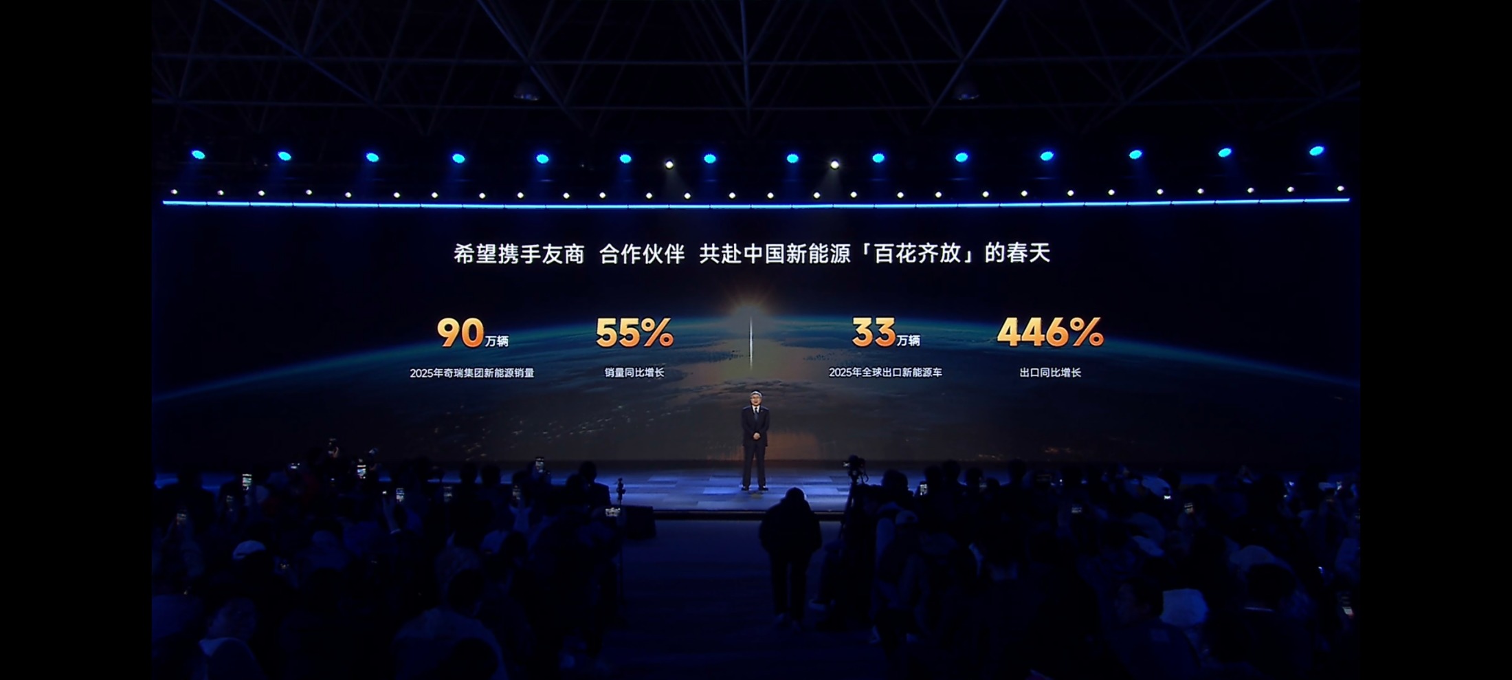 2025年,奇瑞新能源汽车出口33万辆,同比增长446%。图片来源:奇瑞官方微博