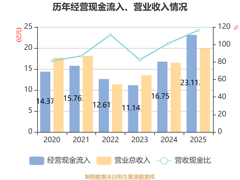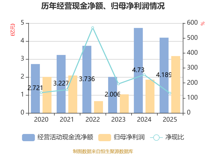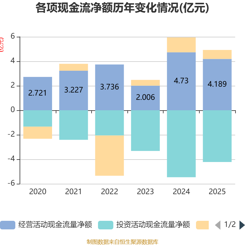 截至2025年,公司经营活动现金流净额为4.19亿元,同比下降11.43%;筹资活动现金流净额7344.94万元,同比减少4820.09万元;投资活动现金流净额-4.23亿元,上年同期为-5.47亿元。