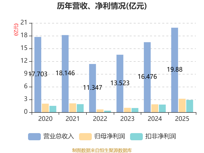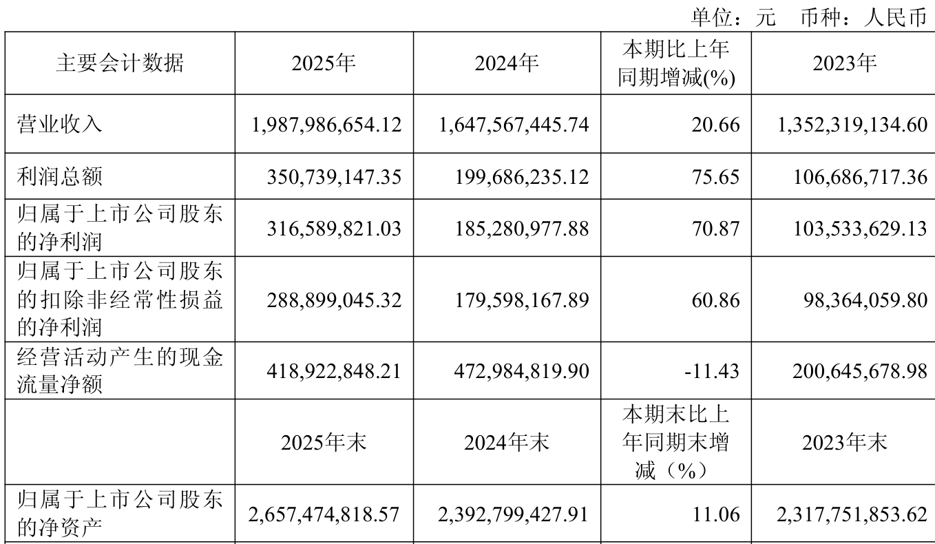 中证智能财讯福达股份(603166)3月26日披露2025年年度报告。2025年,公司实现营业总收入19.88亿元,同比增长20.66%;归母净利润3.17亿元,同比增长70.87%;扣非净利润2.89亿元,同比增长60.86%;经营活动产生的现金流量净额为4.19亿元,同比下降11.43%;报告期内,福达股份基本每股收益为0.5元,加权平均净资产收益率为12.59%。公司2025年度分配预案为:拟向全体股东每10股派现2元(含税)。