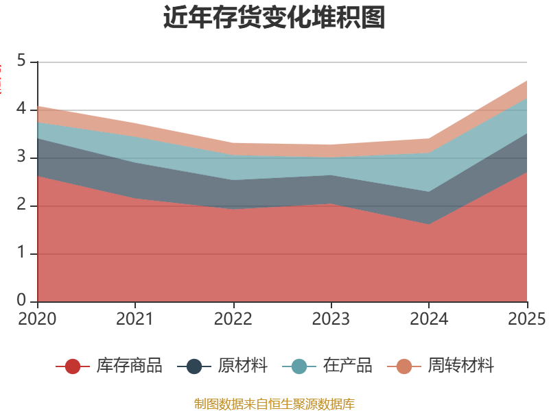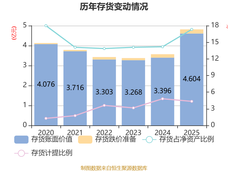 从存货变动来看,截至2025年末,公司存货账面价值为4.6亿元,占净资产的17.32%,较上年末增加1.21亿元。其中,存货跌价准备为2088.31万元,计提比例为4.34%。