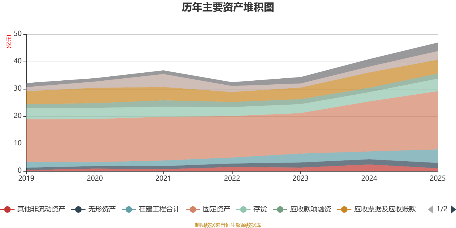 资产重大变化方面,截至2025年末,公司其他非流动资产较上年末减少58.26%,占公司总资产比重下降3.75个百分点;在建工程合计较上年末增加73.63%,占公司总资产比重上升3.58个百分点;应收票据及应收账款较上年末减少10.55%,占公司总资产比重下降3.02个百分点;货币资金较上年末增加49.43%,占公司总资产比重上升1.59个百分点。