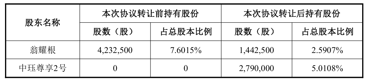 公告显示,本次协议转让前,翁耀根持有公司股份423.25万股,占公司总股本的7.6015%,为公司大股东之一;中珏尊享2号不持有公司股份。本次协议转让的价格为50元/股,协议转让总价款(含税)共计1.40亿元。