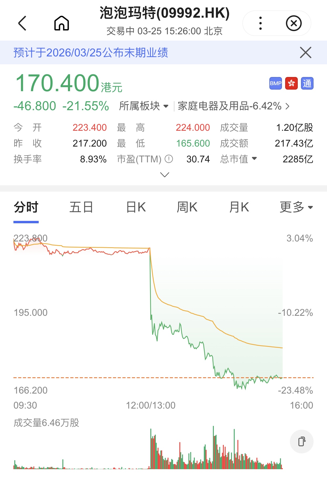 但这份盈利双增的优秀成绩单,并没有体现在资本市场上。3月25日午后开盘,泡泡玛特股价直线跳水,截至当日下午记者发稿时,泡泡玛特报170.400港元/股。