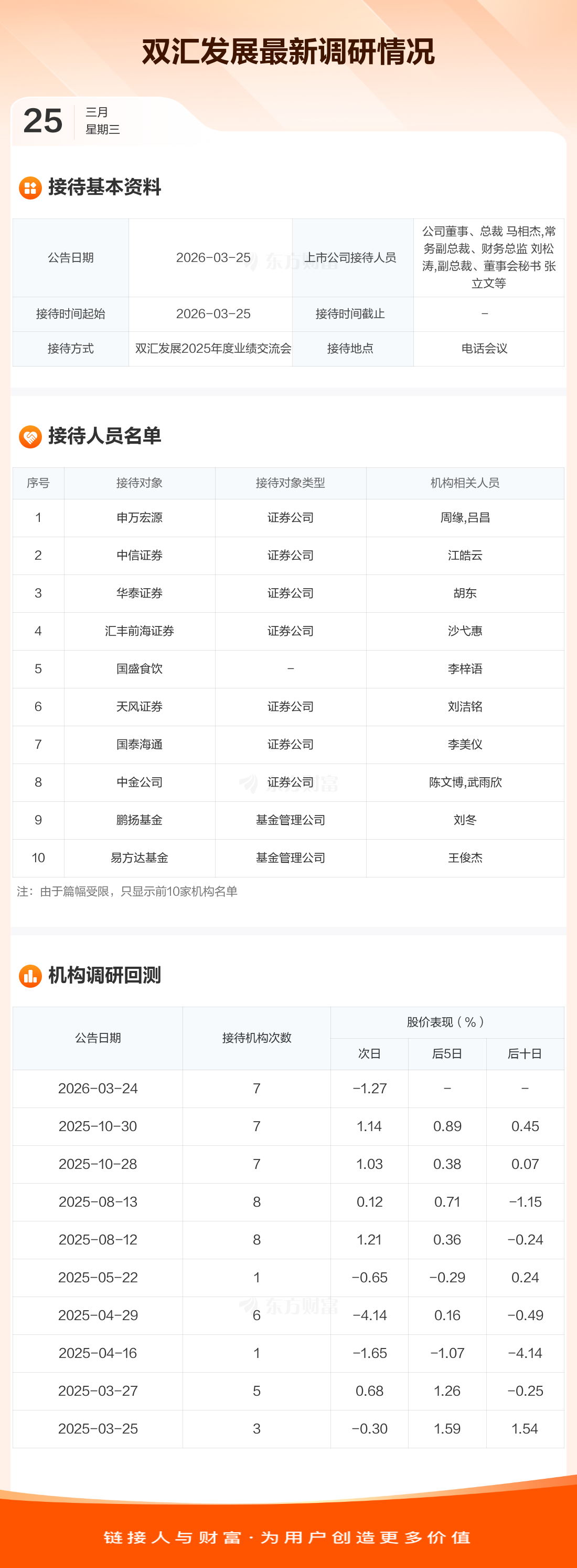 双汇发展3月25日公告称,3月25日接待申万宏源等15家机构调研。接待人员包括公司董事、总裁 马相杰,常务副总裁、财务总监 刘松涛,副总裁、董事会秘书 张立文等。