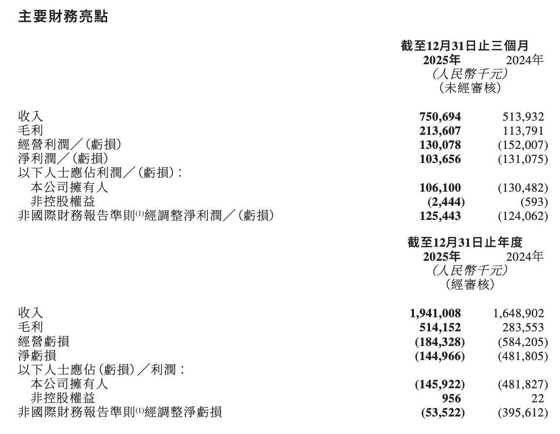 3月25日,速腾聚创(02498.HK)发布2025年第四季度及全年业绩,2025年第四季度实现经营利润1.3亿元,净利润1.04亿元;全年实现收入19.41亿元,同比增加17.7%。毛利为5.14亿元,毛利率提升至26.5%;净亏损为1.45亿元,相较于上年度的净亏损4.82亿元有所收窄。