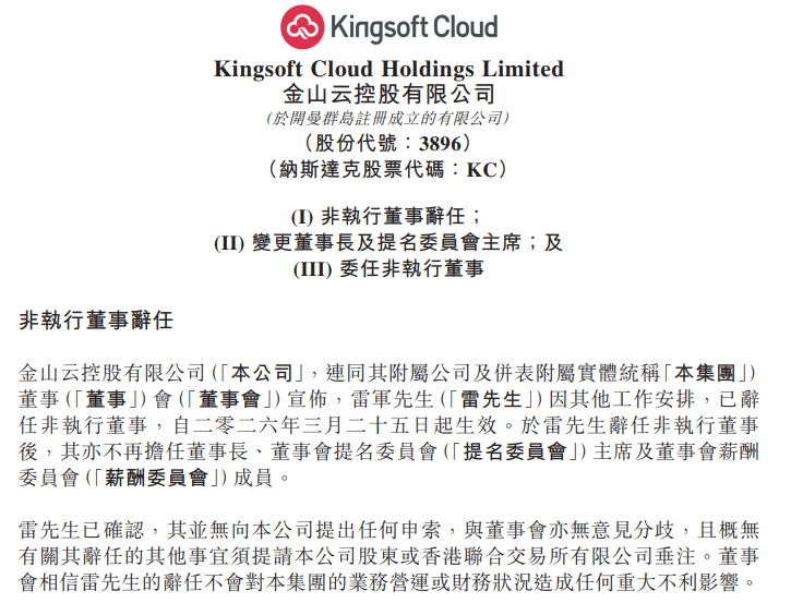 【大河财立方消息】3月25日晚间,金山云控股有限公司(证券简称:金山云)发布公告称,雷军因其他工作安排,已辞任非执行董事,自2026年3月25日起生效。公告中还提到,雷军辞任非执行董事后,其亦不再担任董事长、董事会提名委员会主席及董事会薪酬委员会成员。